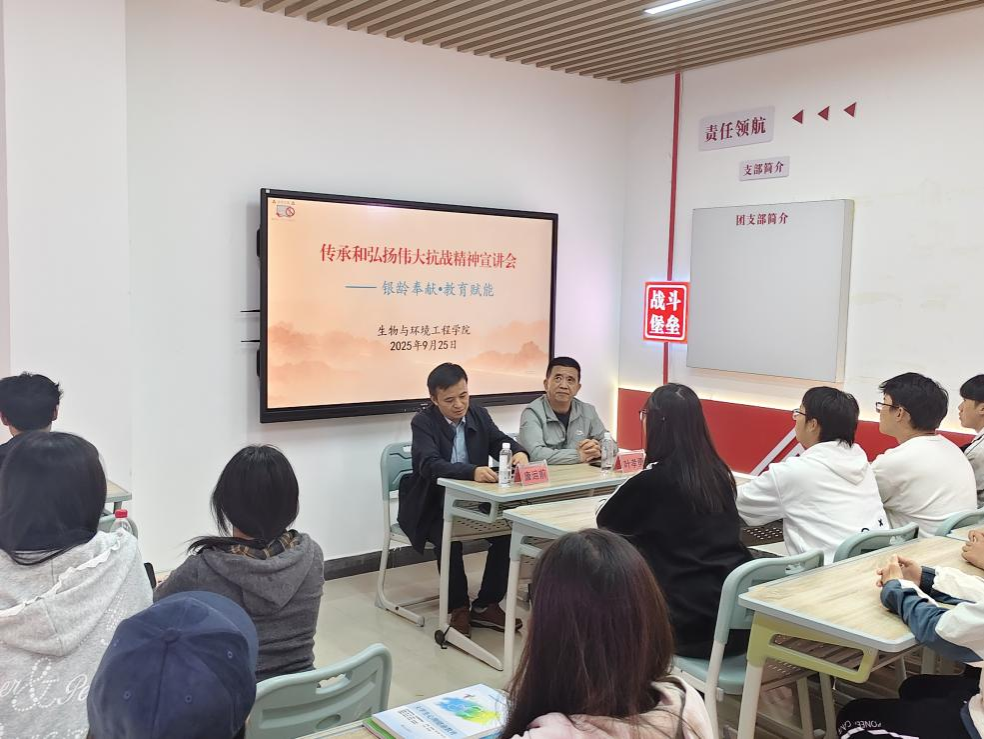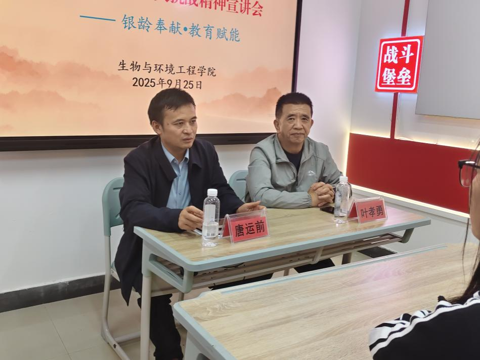 为了深入学习贯彻习近平总书记关于弘扬伟大抗战精神的重要论述,以及习近平总书记在纪念中国人民抗日战争暨世界反法西斯战争胜利80周年大会上的讲话精神,2025年9月25日,生物与环境工程学院关工委组织开展“传承和弘扬伟大抗战精神”宣讲会,学院党委书记、关工委主任唐运前主持会议并总结讲话,学院关工委副主任、原生物与环境工程学院党委委员、副院长叶孝勇同志围绕“传承和弘扬伟大抗战精神”进行宣讲,学院2025级新生代表参加,宣讲会在学生“一站式”服务社区举行。